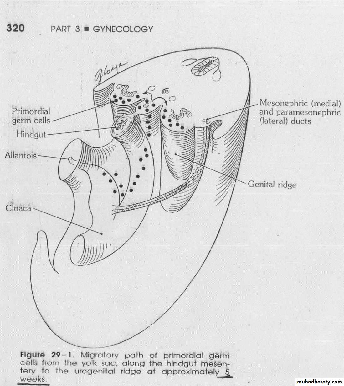 In embryos with XX complement , the cortex differentiate to become the ovary and the medulla regresses. The primordial germ cells develop by the 4th week in the endodermal cells of the yolk sac and during the 5th week they migrate along the dorsal mesentery of the hind gut to the gonadal rigdes and become incorporated into the mesenchyme and the primary sex cord by 6th week.