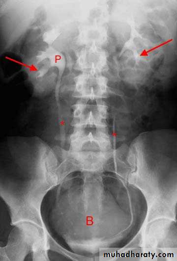 Large volume of CM (50-100mi) is injected intravenously passes to glomerular filtrate concentrated in renal tubules passes to-pelvicaticeal systems ---ureters---bladder.