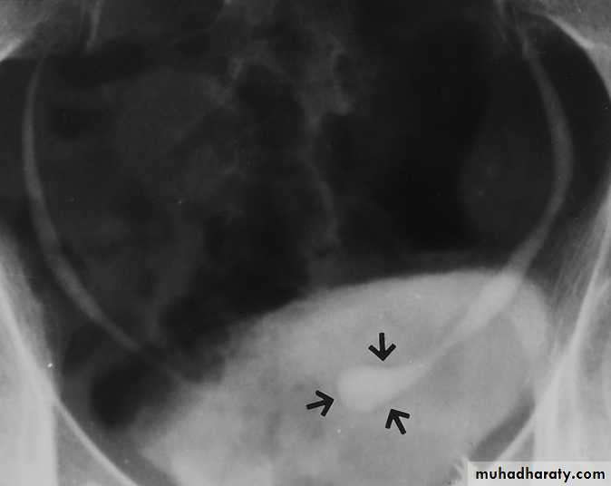 - In obstructed ureterocele , filling defect in the bladder
