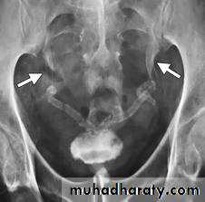 Calcification is most important feature, mainly in bladder & lower ureters , but may involve whole ureters .
