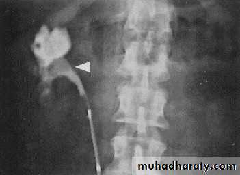 excretion of contrast (opacification of the collecting system which may take many hours), then the level and degree of obstruction can be determined as dilated pelvi-caliceal system and ureter are followed down to the point of obstruction (point of hold up).