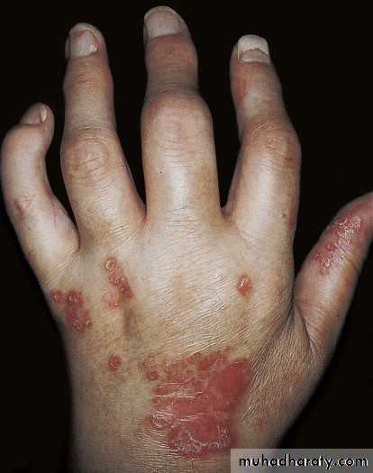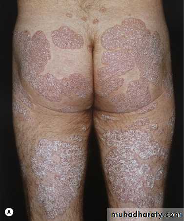 The plaques are irregular, round to oval.Predilection for extensor surfaces such as the elbows and knees but any site can be affected.