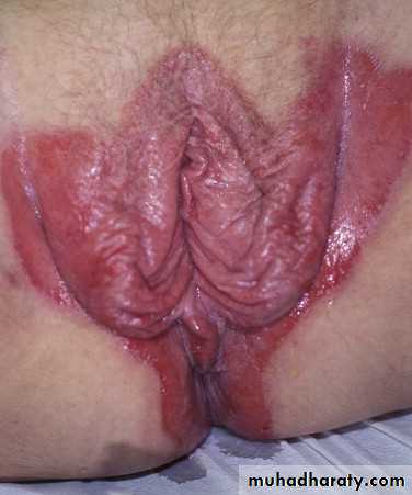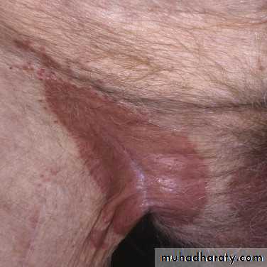 The gluteal fold, axillae, groin, submammary folds, retroauricular fold, and the glans of the uncircumcised penis may be affected.The deep red, smooth, glistening plaques may extend to and stop at the junction of the skin folds, as with intertrigo or Candida infections. The surface is moist and contains macerated white debris. Cracking and fissures are common at the base of the crease.
