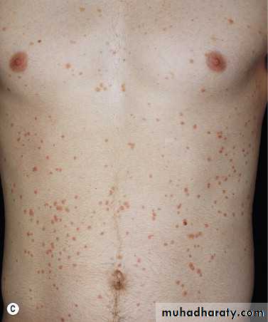 Deep pustules first appear on the middle portion of the palms and insteps of the soles; they may remain localized or spread.The pustules do not rupture but turn dark brown and scaly as they reach the surface.