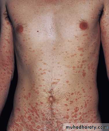 Typically 1- to 2-cm oval plaques appear, a fine, wrinkled, tissue-like scale remains attached within the border of the plaque, giving the characteristic ring of scale, called collarette scale.