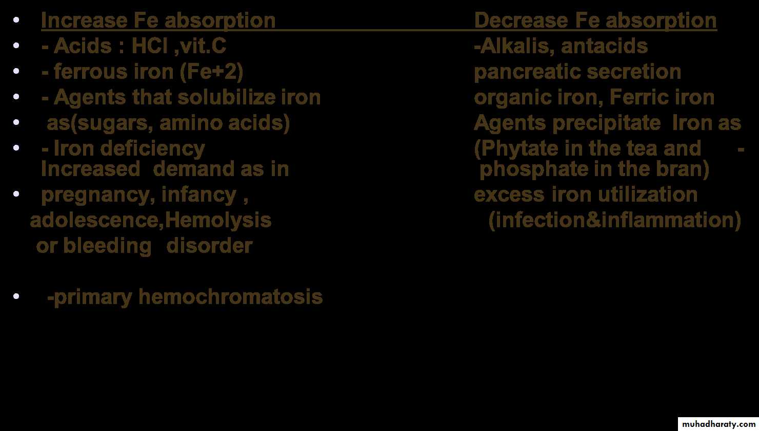 Absorption sites : maximal absorption occur in the duodenum and upper jejunum.The acidic gastric juice reduces insoluble ferric iron to its soluble ferrous state.