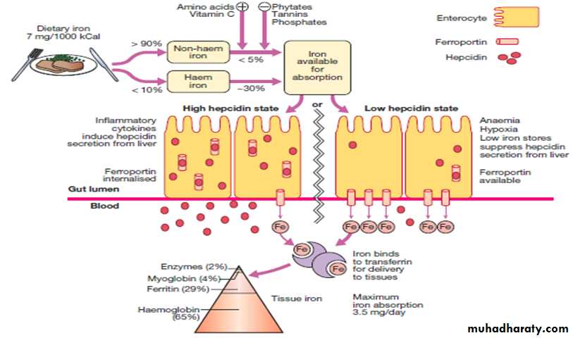 All iron required for red cell production is acquired through the recycling of iron extracts from the senescent red cells.Only 5% of the iron needed for erythropoiesis, or 1 mg /d, is absorbed from GIT to balance losses in the urine, stool, sweat , and de-sequamated skin