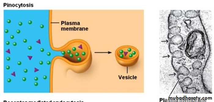 Means cell drinking:is the invagination of the cell membrane to form a pocket, which then pinches off into the cell to form a vesicle filled with a large volume of extracellular fluid and molecules within it .