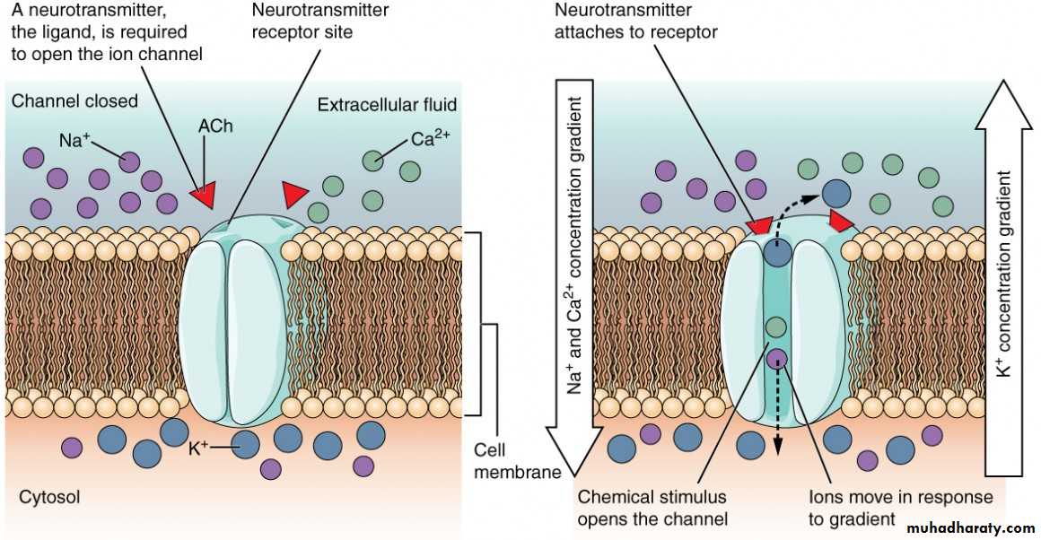 example is sodium channel when the inside of the cell membrane is negative, this cause the sodium gates to remain closed; conversely, when the inside of the membrane loses its negative charge, these gates would open suddenly and allows sodium to pass inward through the sodium pores.