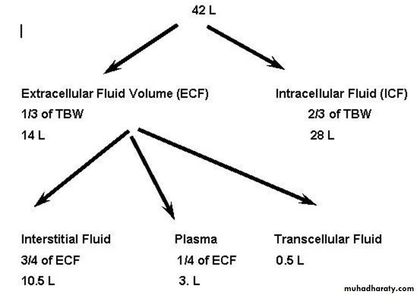 The total body fluid is distributed mainly between two compartments: the extracellular fluid and the intracellular fluid. The extracellular fluid is divided into the interstitial fluid and intravascular fluid(the blood plasma) There is another small compartment of fluid that is referred to as transcellular fluid. This compartment includes fluid in the synovial, peritoneal, pericardial and intraocular spaces, as well as the cerebrospinal fluid; it is usually considered to be a specialized type of extracellular fluid. All the transcellular fluids together constitute about 1 liters.