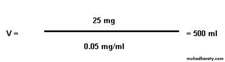 Example: if 25 mg of glucose are added to an unknown volume of distilled water and the final concentration of glucose after mixing is 0.05 mg/ml, then the volume of solvent is