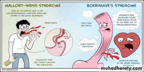 Spontaneous perforation (boerhaave):Occur when a person vomit against closed glottis so the pressure increase rapidly and perforating the esophagus at its weakest point.