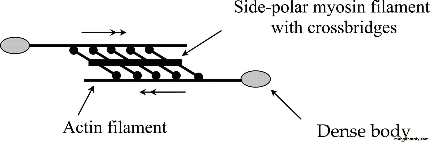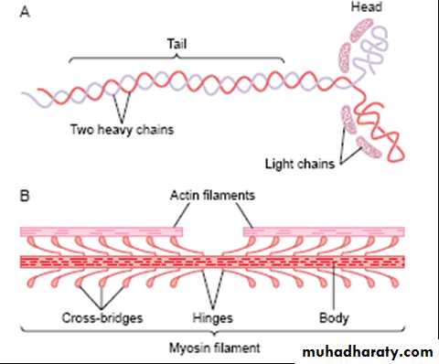 The thick filament (myosin): composed of several hundreds of myosin molecules, each molecule consists of 6 polypeptide chains (4 light and 2 heavy chains). 2 heavy chain wrap spirally form the tail and on the end of the tail folded bilaterally will form the arm and the head. The head of myosin molecule form the cross-bridges which bind with actin. The head of myosin molecule contains actin binding sites and 2 ATPase activity sites (to produce the energy necessary for contraction). (Fig 2)(Fig2)
