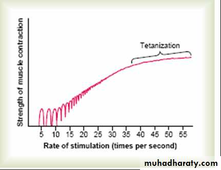 2-Frequency Summation andTetanization by increasing the frequency of contraction. As the frequency increases, here comes a point where each new contraction occurs before the preceding one is over. As a result, the second contraction is added to the first one, so that the total strength of contraction rises progressively.When the frequency reaches a critical level, the successive contractions become so rapid that they fuse together, and the whole muscle contraction appears to be completely smooth and continuous without relaxation This is called tetanization .So that any additional increase in frequency beyond that point has no further effect This occurs because Ca ion is accumulated in sarcoplasm.(fig 13)
