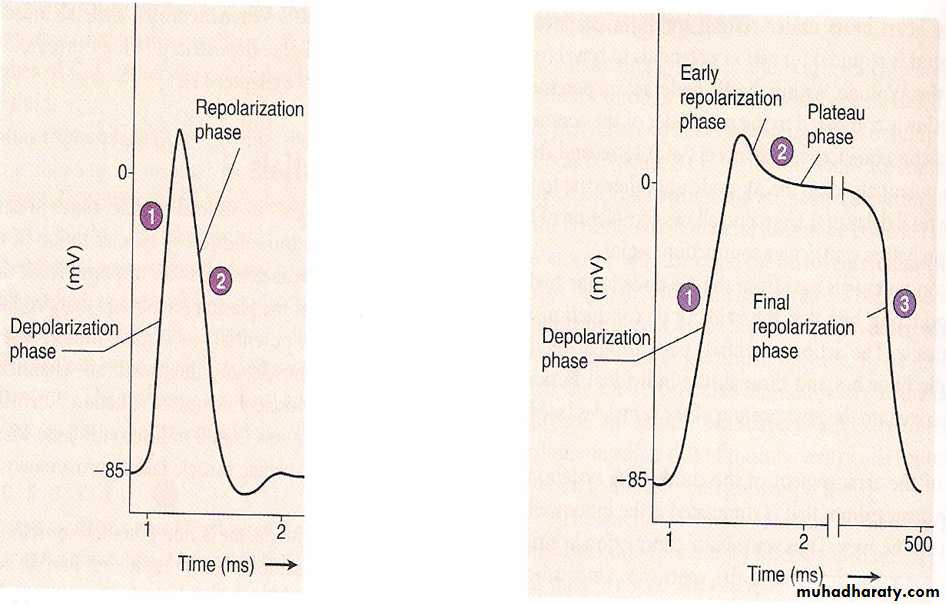 2-Duration of action potential: 1 to 5 milliseconds in skeletal muscle—about five times as long as in large myelinated nerves