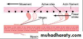 In the relaxed muscle the troponin-I is tightly bound to actin; tropomyosin covers the active sites of actin thus, troponin-tropomyosin complex represent the relaxing proteins which inhibit interaction between actin and myosinWhen the Ca ion bind with troponin C this uncover the active sites of the actin. Then the activated head of myosin cross-bridges attaches to an active sites of actin, here the head automatically tilts towards the arm (called power stroke) so dragging the actin filaments along with it immediately after tilting the head released from the active site then return to its normal perpendicular direction and then it combined with new active site of actin, then the head tilts again, and the actin filament moves another step. Thus, the heads of the cross-bridges step by step walk along the actin filament, pulling the ends of two successive actin filaments toward the center of the myosin this is called “walk-along” theory .(fig 5)