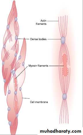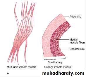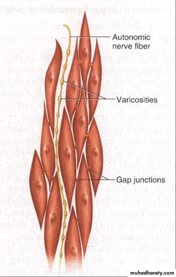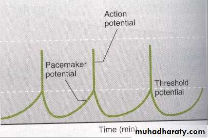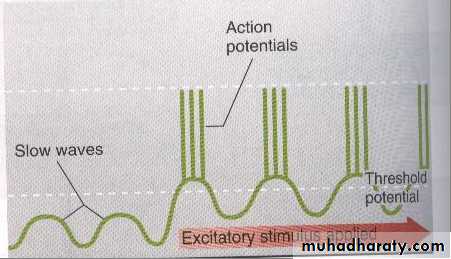 Some type of smooth muscle cell generate action potential spontaneously, plasma membrane of these cell do not maintain constant resting potential instate they gradually depolarized until they reach the threshold potential and produce A.P fallowing repolarization ,membrane begin to depolarized again lead to rhythmical state of contractile activity these cell are pace maker cellother pace maker cell have different pattern of activity, the membrane potential go up and down due to regular variation in Na ion flow across cell membrane this is called slow wave. slow wave rhythm of the membrane potential not an action potential, but when an excitatory in put (as food in intestine ) super imposed, slow wave depolarized above threshold and A.P occur lead to muscle contraction.(fig 18,19(