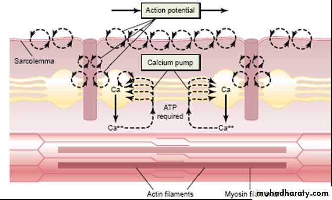 6-After a fraction of a second the Ca ion are pumped back into the sarcoplasmic reticulum where they remain stored until another muscle A.P arrives again .this removal of Ca ion from myofibrils causes muscle contraction to cease.
