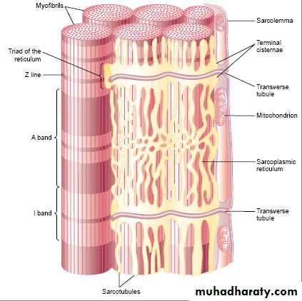 a)The transverse tubules(T-tubules): originate as invaginations from cell membrane, penetrating the muscle fiber from one side to the opposite side, thus communicating with the ECF. T-tubules help for rapid transmission of action potential from the membrane deep into the muscle.