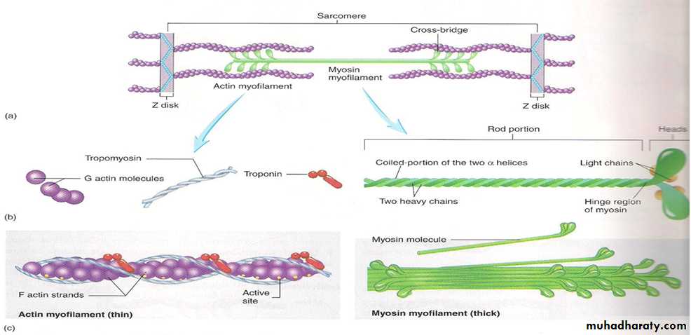 The thin filament (actin): actin filaments composed of three proteins, actin, tropomyosin and troponin(fig 3)Actin contain active sits on its surface in which the cross –bridges of myosin attached