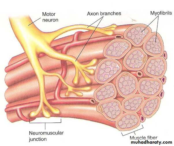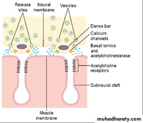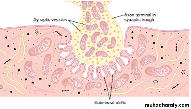 neuromuscular junction: As the motor nerve reaches the muscle fiber, it loses its myelin and divides into a number of terminals. The axon terminal contains many small vesicles of the neurotransmitter acetylcholine. The nerve ending invaginates into a thickened, folded depression in the muscle membrane called the motor end plate (figure 6).Usually there is one junction for each muscle fiber, this invagination is called synaptic gutter and the space between the axon terminal and the muscle fiber is called synaptic cleft(contain acetylcholinesterase that destroy acetylcholine (Ach).Fig 6