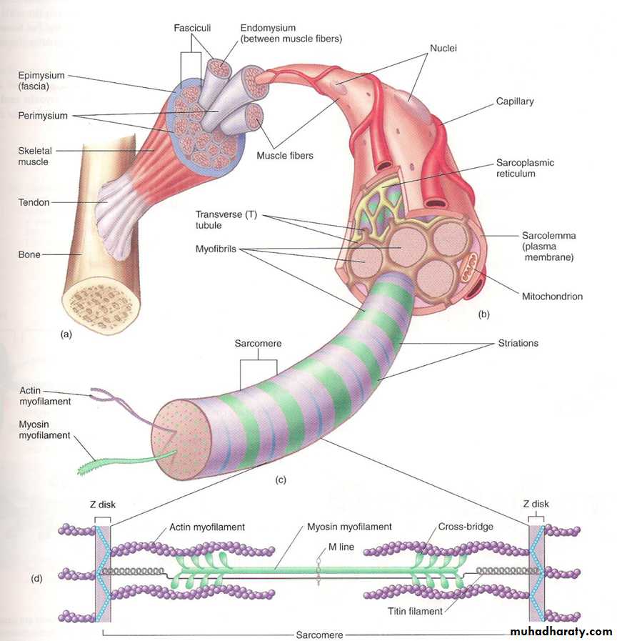 Skeletal muscle is a striated, voluntary (neurogenic) muscle, i.e. needs nerve supply to work. All skeletal muscles are composed of many fibers. Muscle fiber is a single cell, multinucleated cylindrical shape surrounded by cell membrane called sarcolemma and each fiber extends the entire length of the muscle and is usually innervated by only one nerve ending, located near the middle of the fiber. Each of these muscle fibers is made up of successively smaller subunits called (myofibrils). Each myofibrils composed of actin and myosin about 1500 myosin filaments and 3000 actin filaments. (fig 1)