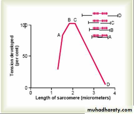 At a point D- at very long sarcomere length a muscle can not develop tension because there is no over lap between actin and myosin filaments