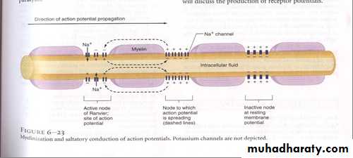 In myelinated axons, AP will jump from one node of Ranvier to another (myelin acts as an insulator). This type of conduction is called saltatory conduction which is about 50 times faster than the unmyelinated fiber(figure 9). That is, electrical current flows through the surrounding extra-cellular fluid outside the myelin sheath as well as through the axoplasm inside the axon from node to node, exciting successive nodes one after anotherRepolarization starts at the point of original stimulus and spreads in the same direction of depolarization.