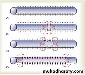 Nerve cell membranes are polarized at rest with outside positive. When stimulus of enough strength is applied on axon, an AP will be generated at the site of stimulation causing polarity to be reversed (inside becomes positive). Positive charges then move from the adjacent part of membrane to the area of negativity creating a local circuit of current flow between the depolarized area and the adjacent resting area of the membrane, this will decrease the polarity of the adjacent membrane thus activating new Na channels and when the firing level is reached, a new AP develops. This spontaneous sequence of events will move along the unmyelinated axon to its end (figure 8). The moving impulse does not depolarize the area behind it because it is refractory.
