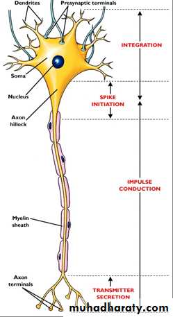 MORPHOLOGYNerve cell represents the building unit of the nervous system with the specialized function of impulse transmission. Typical nerve cell has a cell body (soma) with 5-7 short projections (dendrites) and a longer fibrous axon. The dendrites, receive impulses from other cells and transfer them to the cell body (afferent signals). The axon ends in a number of synaptic knobs (terminal buttons) which stores the neurotransmitter synthesized by the cell body. Axons of some nerve fibers have a myelin sheath, a protein-lipid insulator formed by Schwann cell wrapping around the axon. The sheath envelops the axon except at its ends and periodic constrictions of 1 mm distance called (node of Ranvier), these are called myelinated nerve fibers while those without myelin sheath are called unmyelinated nerve fibers (figure1).