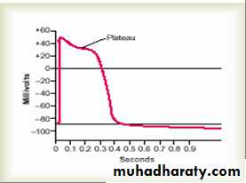 In some excitable tissues, repolarization does not occur immediately after depolarization, instead the membrane potential remains near the peak of spike for many milliseconds(plateau) before repolarization starts, therefore plateau greatly prolongs the period of depolarization(figure 10). This type of AP is seen mainly in cardiac muscle where it lasts for as long as 0.3-0.5 seconds thus prolonging the time for cardiac contraction. Plateau is due to: