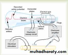 An electrical instrument used to record very small electrical events in millivolt (mv) which occurs very rapidly in millisecond (ms) in the living tissues. It consists of a cathode which emits a beam of electrons directed to strike a florescent face emitting light. A record of AP can be obtained. CRO has two electrodes applied to the nerve, a stimulating electrode and a recording one(figure 5).(figure 5)