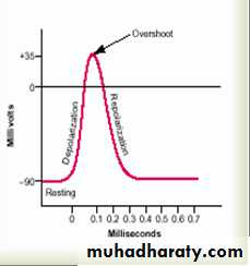 1. Resting stage: The membrane is said to be “polarized” during this stage ,–90 millivolts negative membrane potential is present.