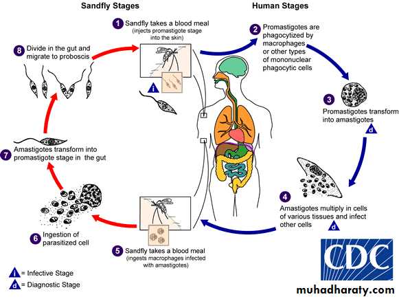 life cycleThe life cycle involves the sandfly as the vector and a variety of mammals such as dogs, foxes, and rodents as reservoirs. Only female flies are vectors because only they take blood meals (a requirement for egg maturation). Shortly after an infected sandfly bites a human, the promastigotes are engulfed by macrophages, where they transform into amastigotes. The infected cells die and release amastigotes that infect other macrophages and reticuloendothelial cells. When the female sandfly(phlebotomus) sucks blood from an infected host, it ingests macrophages containing amastigotes. After dissolution of the macrophages, the freed amastigotes differentiate into promastigotes in the gut. They multiply and then migrate to the pharynx, where they can be transmitted during the next bite. The cycle in the sandfly takes approximately 10 days.