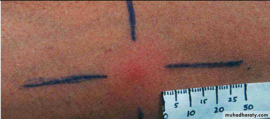 5- Leishmanin skin test (Montenegro test): involves the forearm intradermal injection of 0.1 ml suspension of killed promasitigote, this test is used to measure delayed hypersensitivity. Positive result is indicated by an induration of 5mm or more in 48-72 hours. In cutaneous leishmaniasis this test is positive.