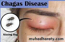 The acute phase of Chagas’ disease : consists of facial edema and a nodule (chagoma) near the bite site, coupled with fever, lymphadenopathy, and hepatosplenomegaly. A bite around the eye can result in unilateral palpebral swelling & conjuctuvitis ( Romana’s sign). The acute phase resolves in about 2 months.Most individuals then remain asymptomatic, but some progress to the chronic form with myocarditis and megacolon.