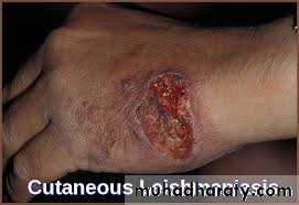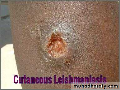 A: cutaneous leishmaniasisThe initial lesion is a red papule at the bite site, usually on an exposed extremity. This enlarges slowly to form multiple satellite nodules that coalesce and ulcerate.