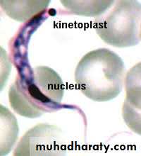 1- Microscopic detection of trypomastigotes in peripheral blood: the parasites are typically C or U shaped with projecting kinetoplast.