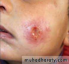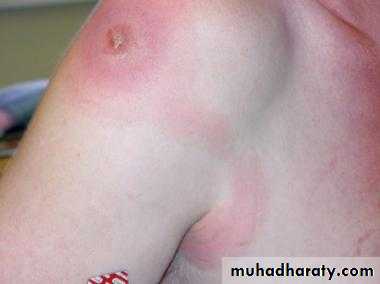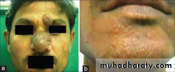 begins with a papule at the bite site, but then metastatic lesions form, usually at the mucocutaneous junction of the nose and mouth. Disfiguring granulomatous, ulcerating lesions destroy nasal cartilage but not adjacent bone. These lesions heal slowly.Death can occur from secondary infection.