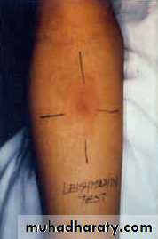 4- Animal inoculation: aspirate or biopsy material may be inoculated subsequently into the nose of a hamster and the animal watched for nasal inflammation.5- Leishmanin skin test (Montenegro test): involves the forearm intradermal injection of 0.1 ml suspension of killed promasitigote, this test is used to measure delayed hypersensitivity. Positive result is indicated by an induration of 5mm or more in 48-72 hours. In cutaneous leishmaniasis this test is positive.