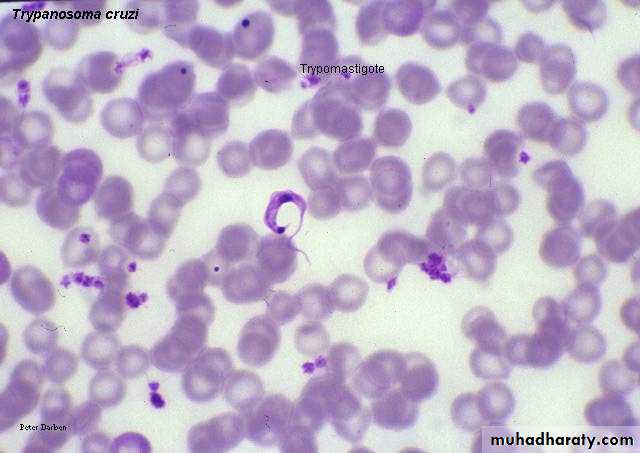 1- Microscopic detection of trypomastigotes in peripheral blood:the parasites are typically C or U shaped with projecting kinetoplast.