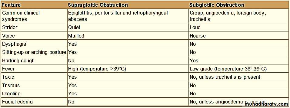 The differential diagnosis of airway obstruction varies with patient age and can also be subdivided into supraglottic and subglottic causesAge-Related Differential Diagnosis of Upper Airway Obstruction