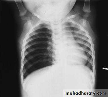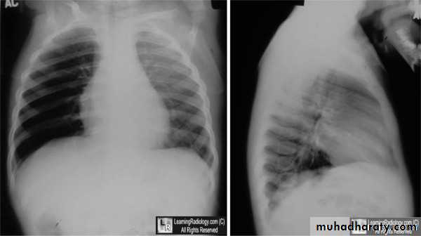 Expiratory chest radiograph in a 12-month-old boy with a 2-month history of wheezing demonstrates continued hyperlucency and hyperexpansion of the right hemithorax.