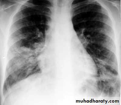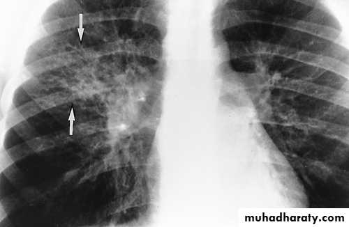 CXR: interstitial or bronchopneumonic, involve mainly the lower lobes. Bilateral diffuse infiltrates, lobar pneumonia or hilar lymphadenopathy can occur in up to 30% . Pleural effusions may occur.