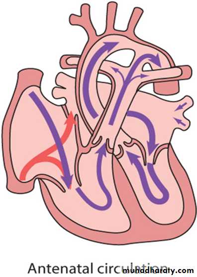 The pressure in the right atrium is higher than in the left, as it receives all the systemic venous return including blood from the placenta.