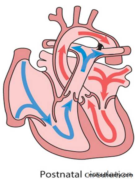 With the first breaths, resistance to pulmonary blood flow falls and the volume of blood flowing through the lungs increases sixfold. This results in a rise in the left atrial pressure. Meanwhile, the volume of blood returning to the right atrium falls as the placenta is excluded from the circulation. The change in the pressure difference causes the flap valve of the foramen ovale to be closed. The ductus arteriosus will normally close within the first few hours or days.