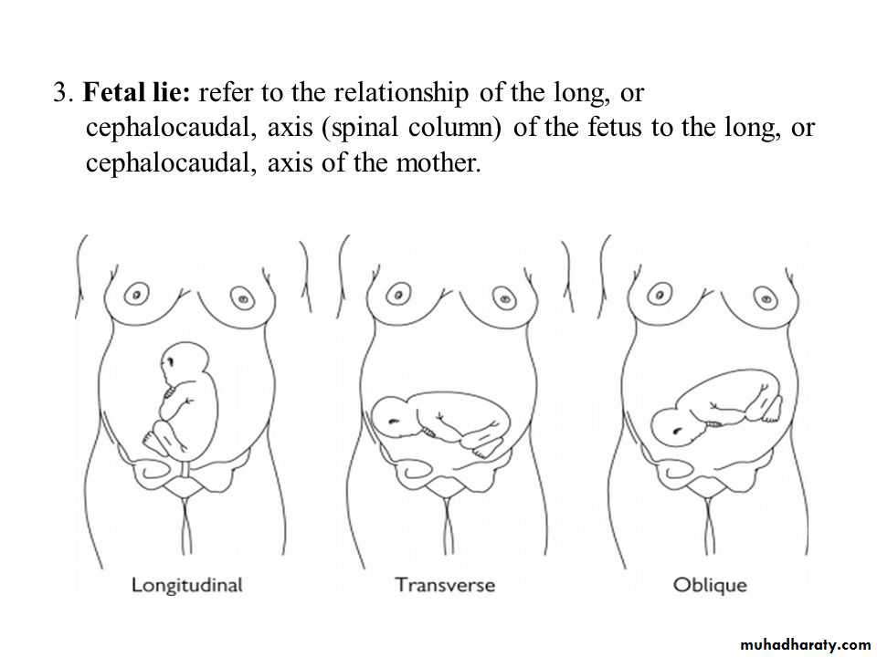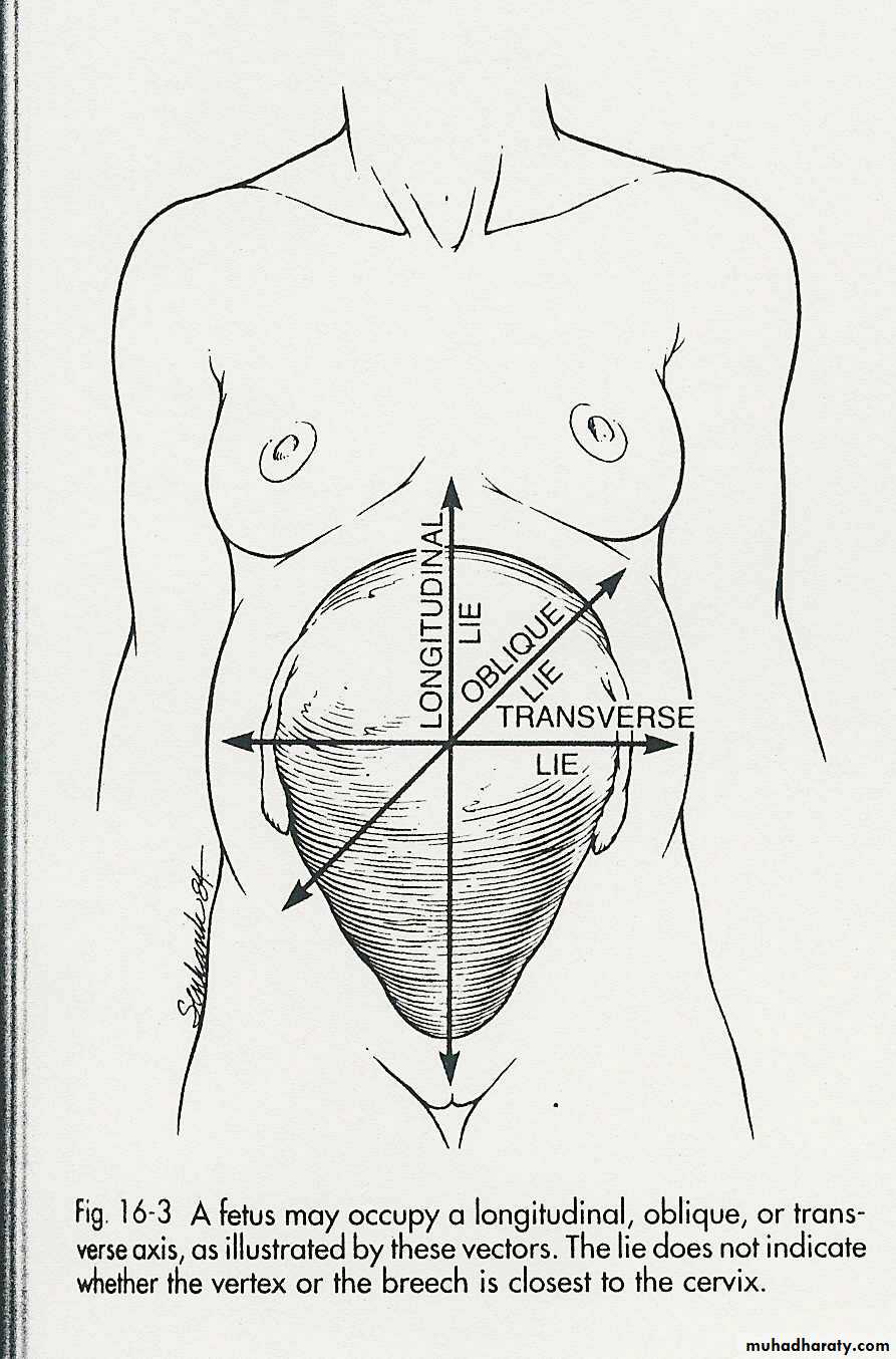3.oblique lie :maternal and fetal axis cross at 45 angle most are unstable and become longitudinal or transverse at labor.