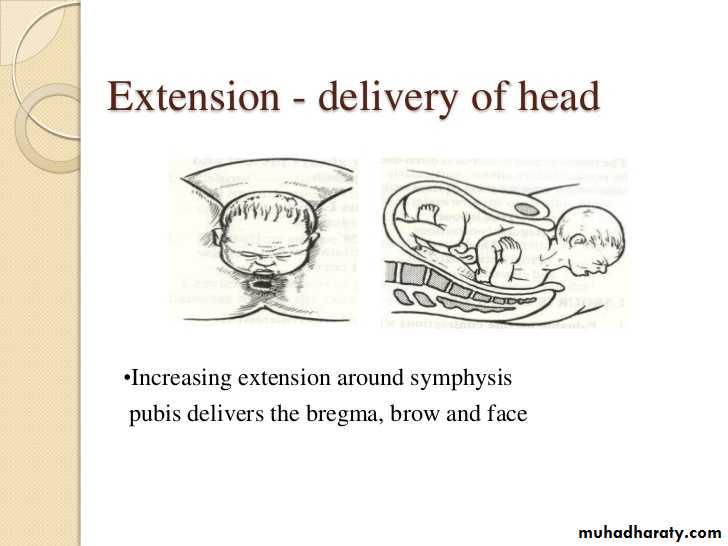 Folloing compietion of internal rotation ,When the flexed head reaches the vulva it undergoes extension the base of the occiput will be in direct contact with the inferior margin of the symphysis pubisCrowning the largest diameter of the fetal head is encircled by the vulvar ring