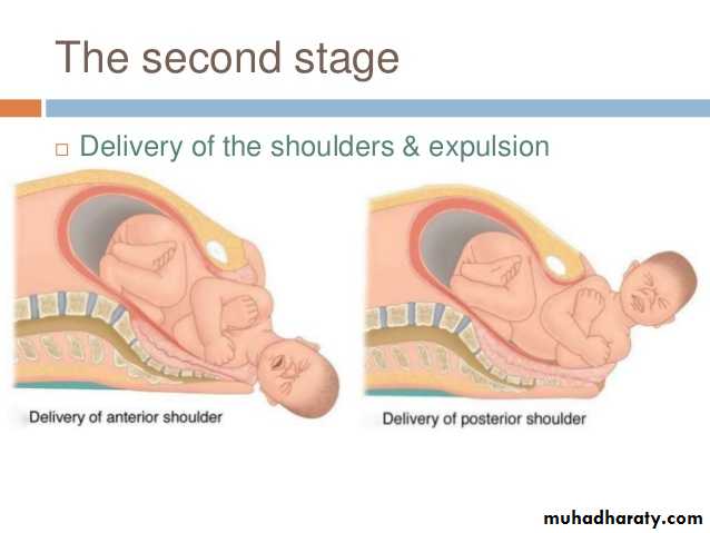 When restitution & external rotation have occurred,the shoulders will be in the AP position.The anterior shoulder is under the symphysis pubis and delivers first,and the posterior shoulder deliveres subsequently.