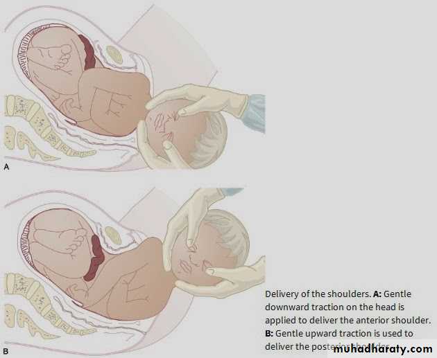 Although this process may occur without assistance,lateral traction is often exerted by gently pulling the fetal head in a downward direction to help release the anterior shoulder from beneath the pubic symphysis